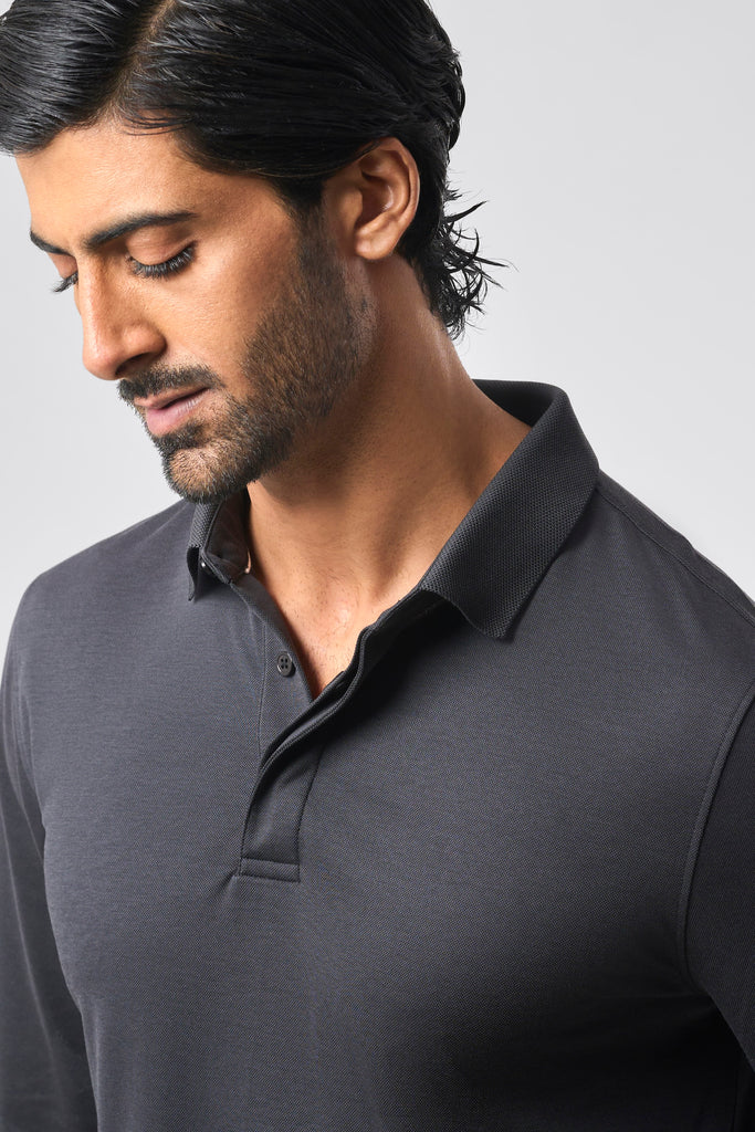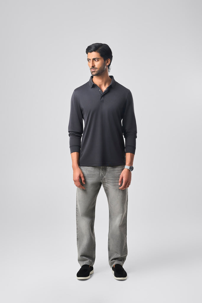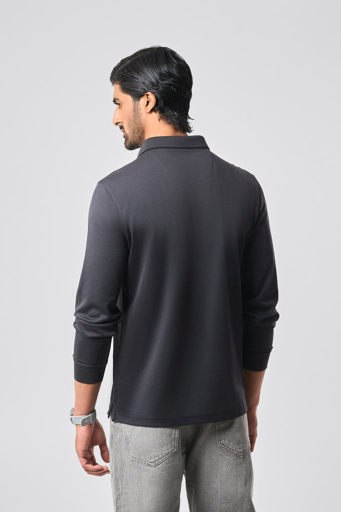 A full-sleeve polo in Charcoal Black, shaped in a smooth cotton-poly blend that feels grounded and refined. The fly-front placket, marked by a single visible button at the top of the placket, brings a composed, executive finish.