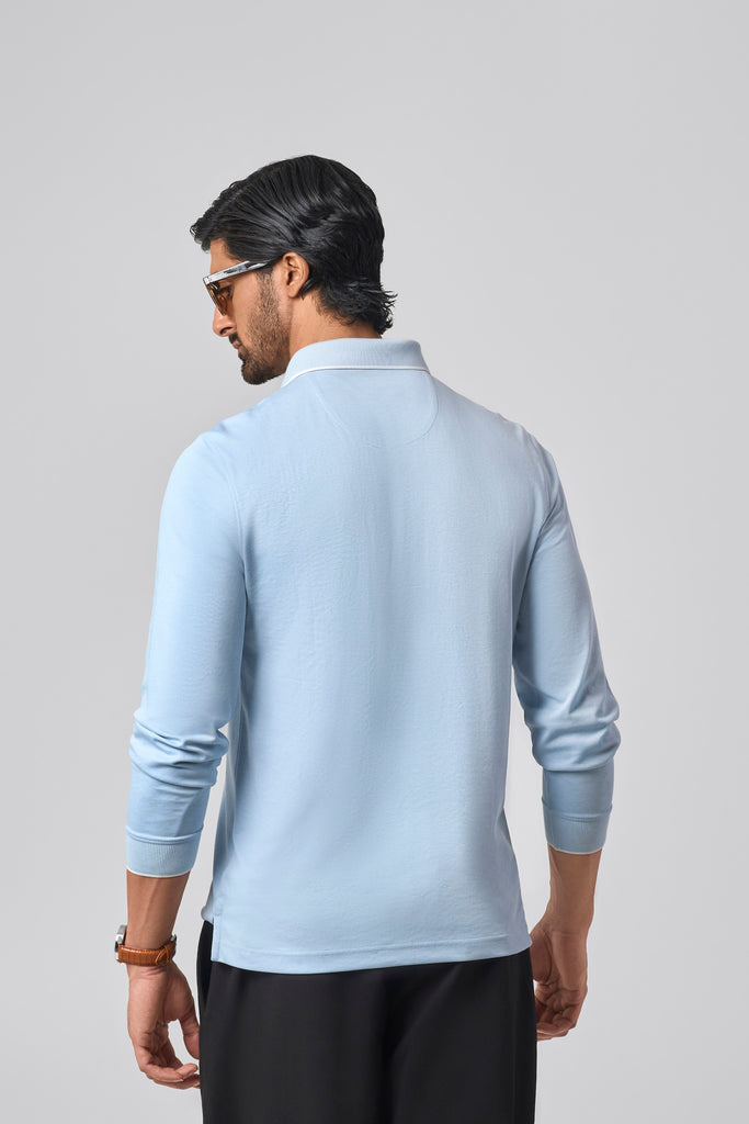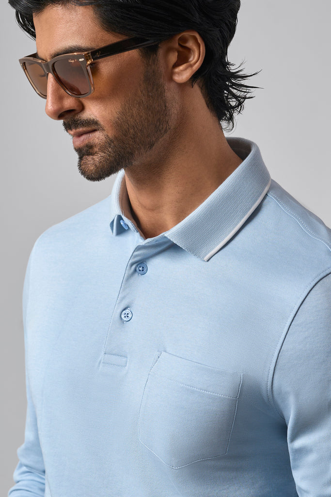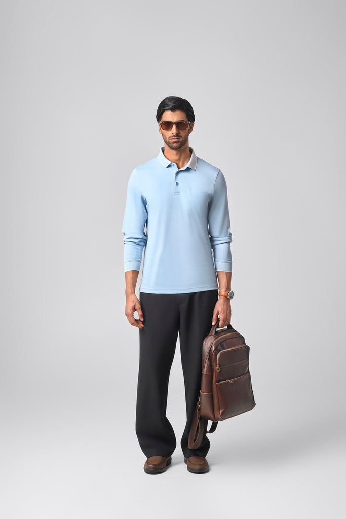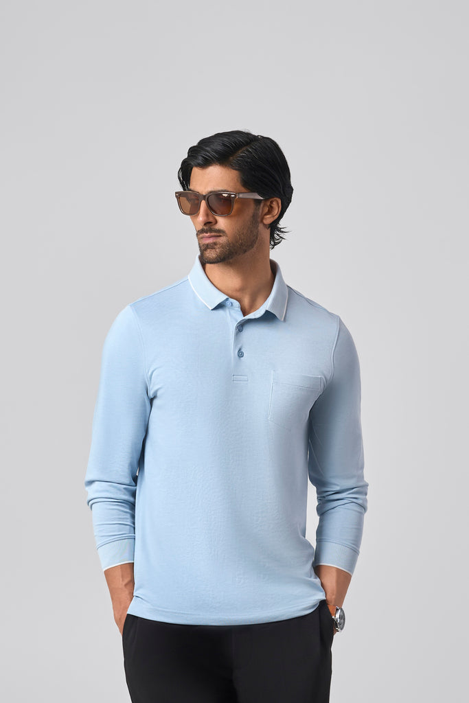 In Azure Blue, this full sleeve polo is crafted from a soft cotton poly blend with a smooth, vintage-inspired feel. The classic 3-button placket pairs with a subtle pocket and self-designed collar and cuffs, giving it a refined, formal edge. A thoughtful addition to the Season of Style, grounded, versatile, and distinctly Goodomen.