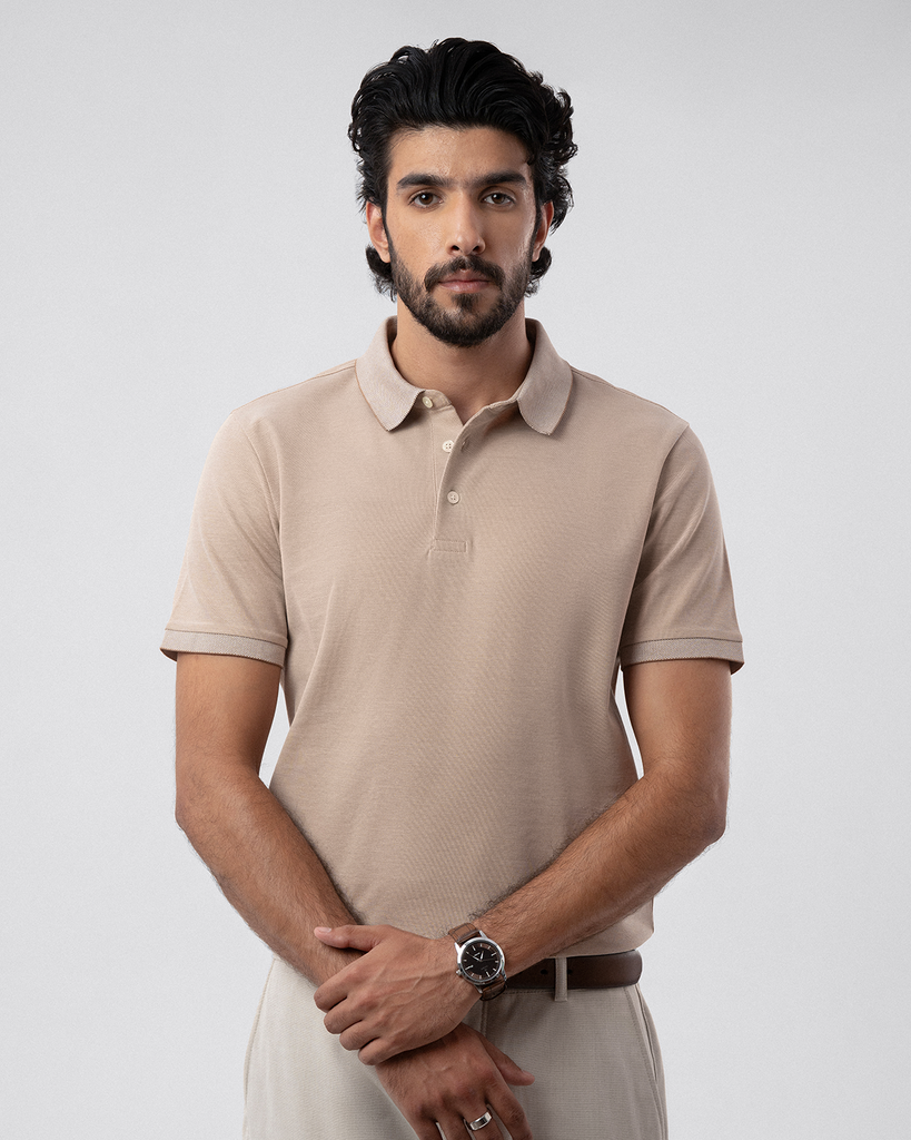 The Brilliant Beige Polo Shirt is crafted from 100% premium cotton in a soft mercerised pique fabric. Designed with a subtle self-pattern on the collar and cuffs, it offers a smart, comfortable fit in a half-sleeve, 3-button style.