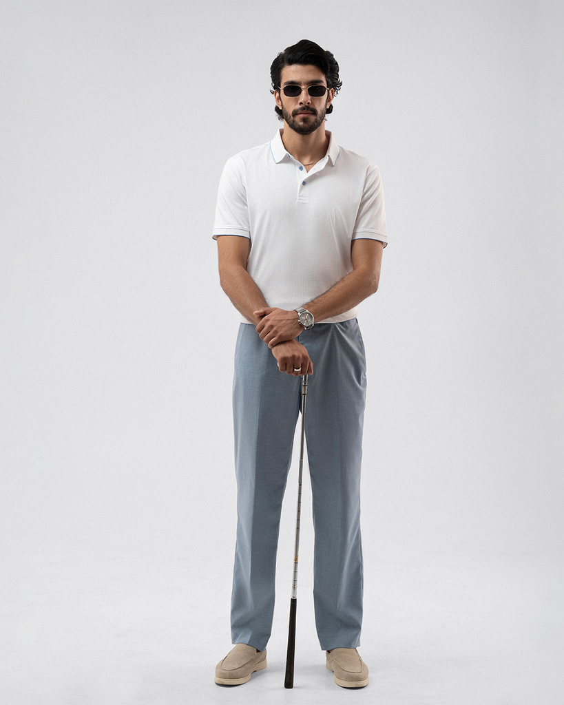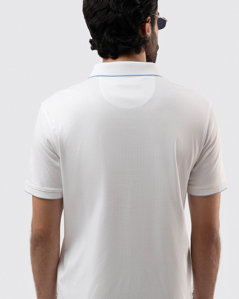 The Subtle White Polo Shirt is made from 100% premium cotton in a soft drop needle interlock fabric. Featuring light blue tipping on the collar and cuffs with contrast buttons, it’s tailored for a smart, comfortable fit in a classic half-sleeve, 3-button style.